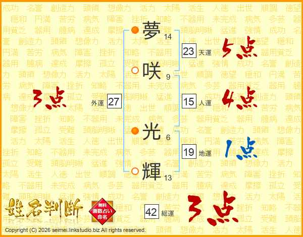夢(14画)咲(9画) 光(6画)輝(13画)