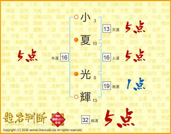 小夏光輝さんの総運は32画の5点!