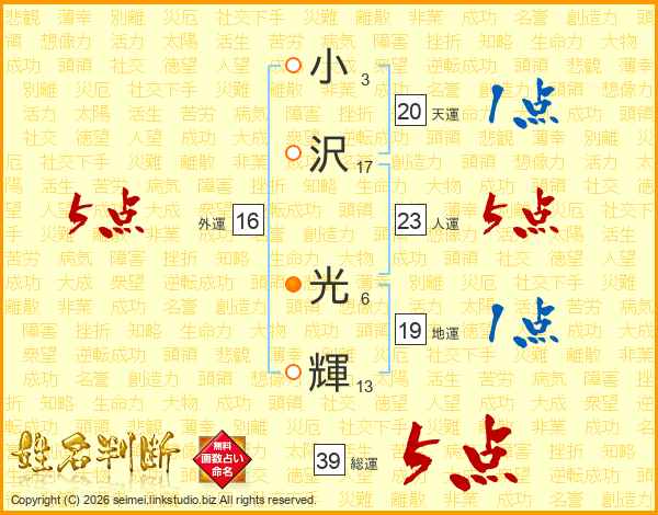 小(3画)沢(17画) 光(6画)輝(13画)