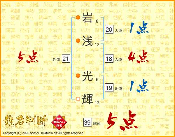 岩(8画)浅(12画) 光(6画)輝(13画)