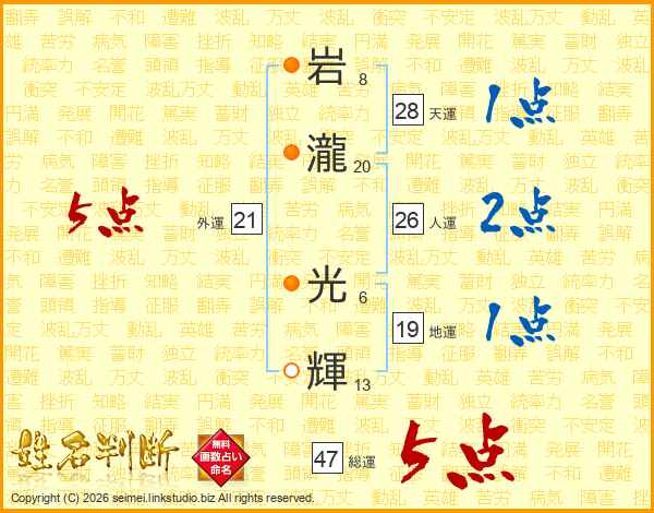 岩(8画)瀧(20画) 光(6画)輝(13画)