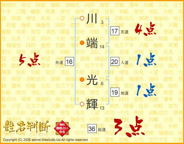 川端光輝さんの総運は36画の3点!