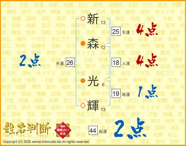 新森光輝さんの総運は44画の2点!