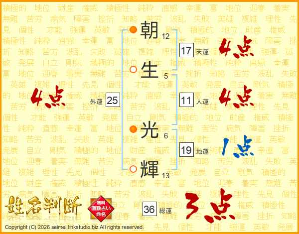 朝(12画)生(5画) 光(6画)輝(13画)
