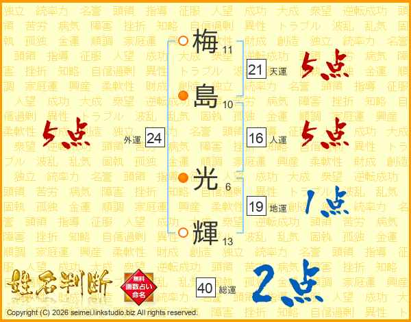 梅(11画)島(10画) 光(6画)輝(13画)