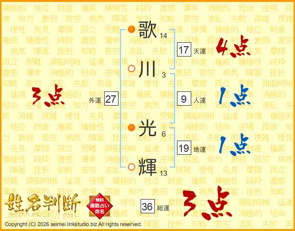 歌川光輝さんの天運は17画の4点!