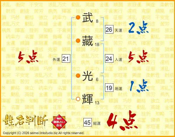 武(8画)藏(18画) 光(6画)輝(13画)