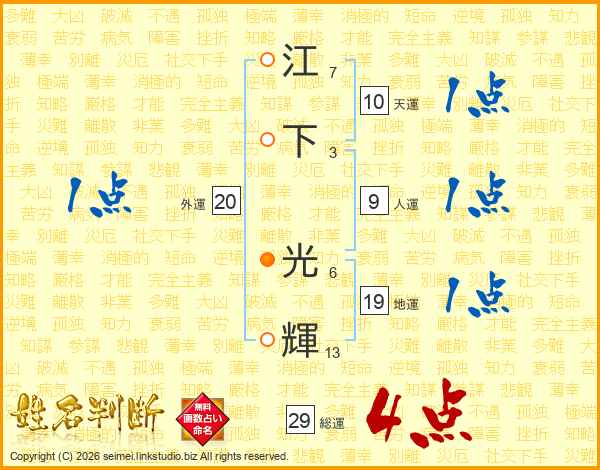 生活面を象徴する運勢です。外部から受ける影響力を表し、結婚運、家庭運や職場、環境への順応性を表します。総運から人運を引いた画数。姓や名が1文字の場合を除く。