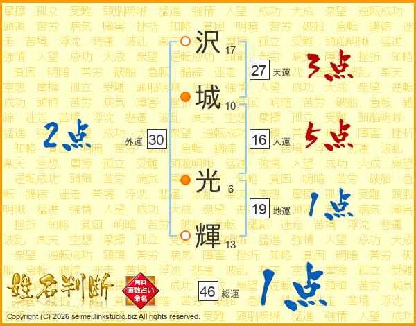 生活面を象徴する運勢です。外部から受ける影響力を表し、結婚運、家庭運や職場、環境への順応性を表します。総運から人運を引いた画数。姓や名が1文字の場合を除く。