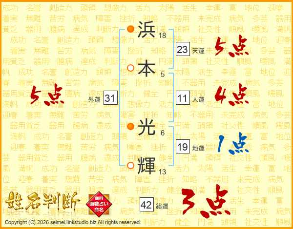 あなたの人生を表す1番重要な運勢です。生涯を通じて影響する総合運となり、主に50歳以降の晩年期に影響を及ぼします。苗字と名前の合計画数。