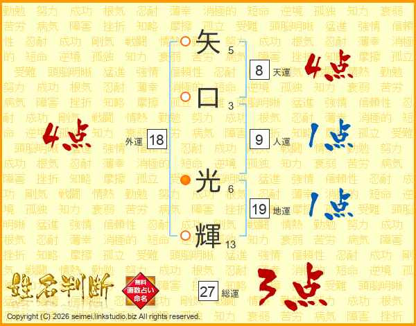 あなたの人生を表す1番重要な運勢です。生涯を通じて影響する総合運となり、主に50歳以降の晩年期に影響を及ぼします。苗字と名前の合計画数。
