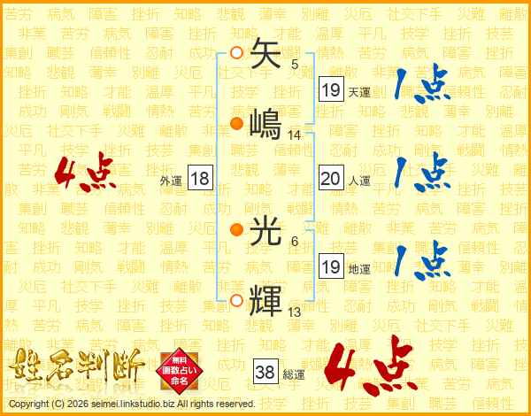 矢(5画)嶋(14画) 光(6画)輝(13画)
