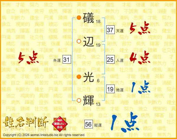 礒(18画)辺(19画) 光(6画)輝(13画)