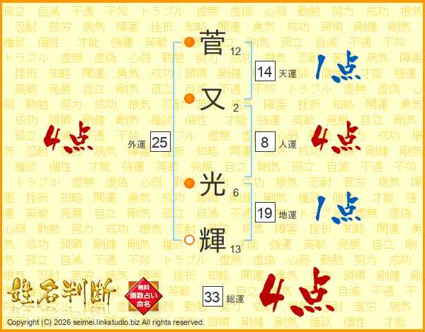 あなたの人生を表す1番重要な運勢です。生涯を通じて影響する総合運となり、主に50歳以降の晩年期に影響を及ぼします。苗字と名前の合計画数。