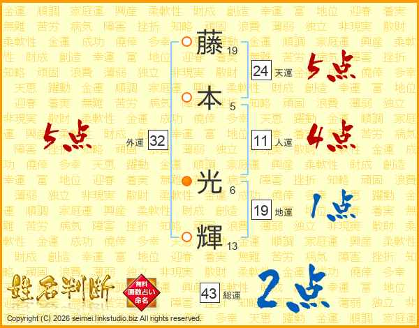 藤(19画)本(5画) 光(6画)輝(13画)