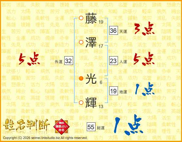 藤(19画)澤(17画) 光(6画)輝(13画)