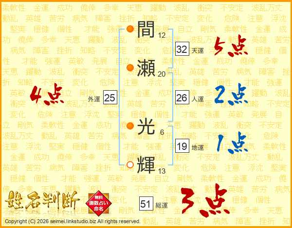 間瀬光輝さんの人運は26画の2点!