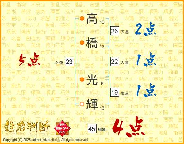 高(10画)橋(16画) 光(6画)輝(13画)