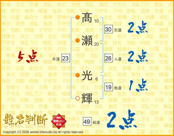 髙(10画)瀬(20画) 光(6画)輝(13画)