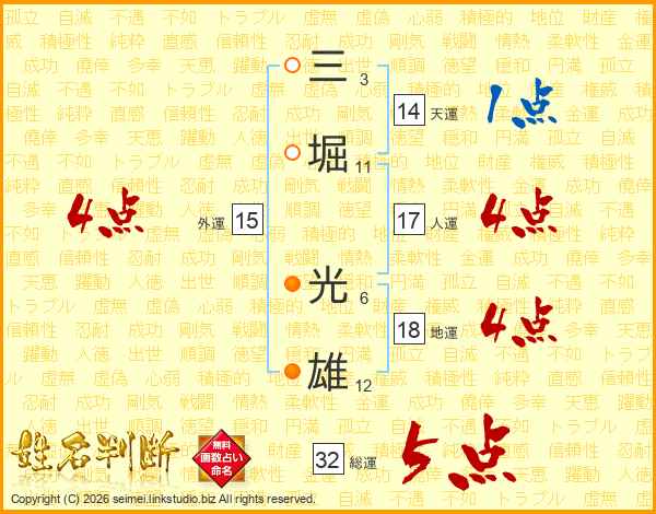 生活面を象徴する運勢です。外部から受ける影響力を表し、結婚運、家庭運や職場、環境への順応性を表します。総運から人運を引いた画数。姓や名が1文字の場合を除く。