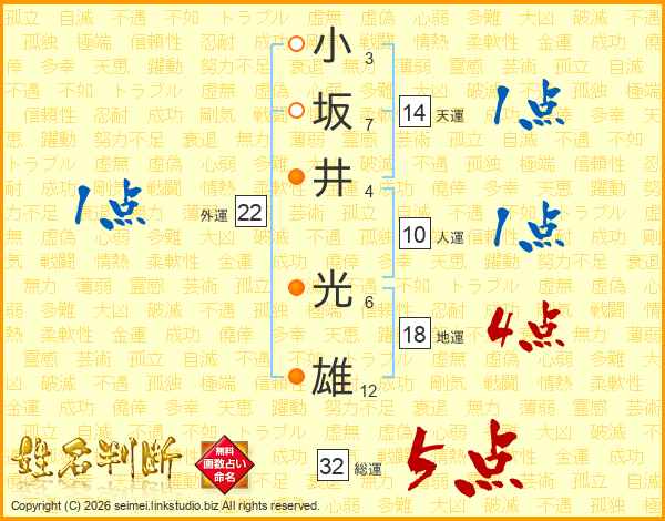 小(3画)坂(7画)井(4画) 光(6画)雄(12画)