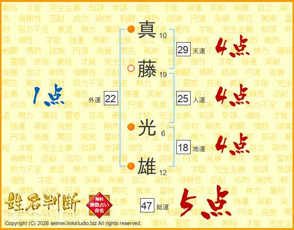 あなたの人生を表す1番重要な運勢です。生涯を通じて影響する総合運となり、主に50歳以降の晩年期に影響を及ぼします。苗字と名前の合計画数。