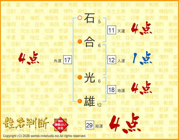 あなたの人生を表す1番重要な運勢です。生涯を通じて影響する総合運となり、主に50歳以降の晩年期に影響を及ぼします。苗字と名前の合計画数。