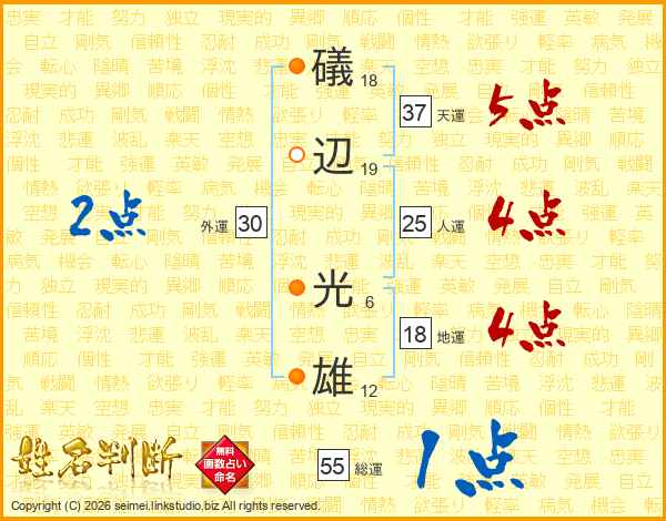 礒(18画)辺(19画) 光(6画)雄(12画)