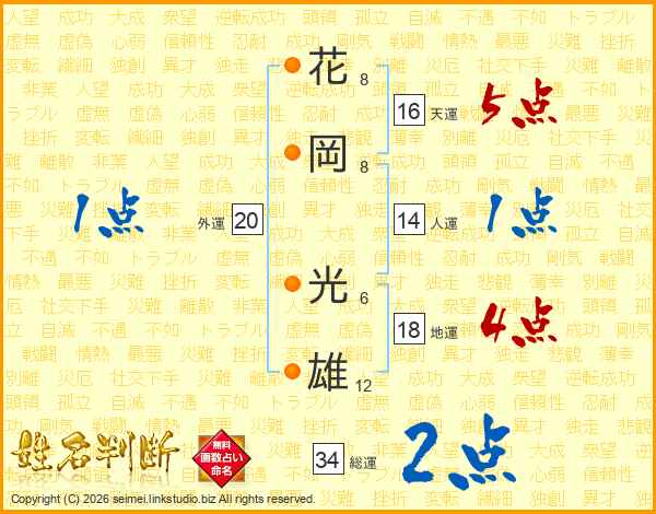 あなたの人生を表す1番重要な運勢です。生涯を通じて影響する総合運となり、主に50歳以降の晩年期に影響を及ぼします。苗字と名前の合計画数。