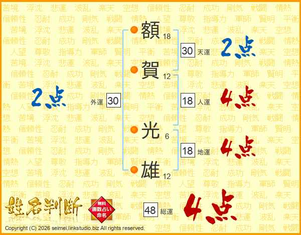 額(18画)賀(12画) 光(6画)雄(12画)