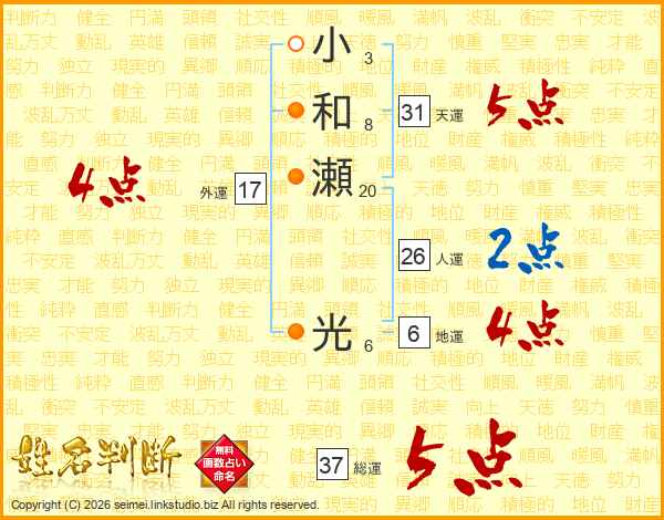 生活面を象徴する運勢です。外部から受ける影響力を表し、結婚運、家庭運や職場、環境への順応性を表します。総運から人運を引いた画数。姓や名が1文字の場合を除く。