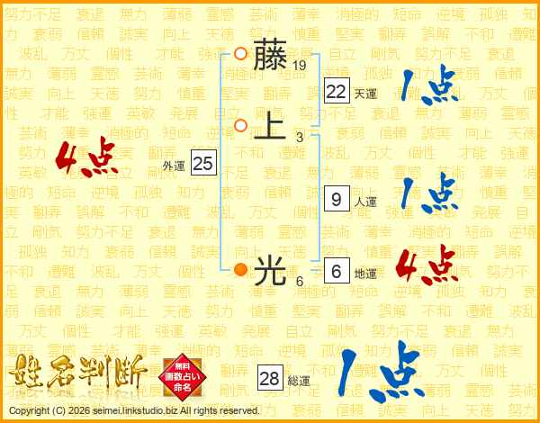 生活面を象徴する運勢です。外部から受ける影響力を表し、結婚運、家庭運や職場、環境への順応性を表します。総運から人運を引いた画数。姓や名が1文字の場合を除く。