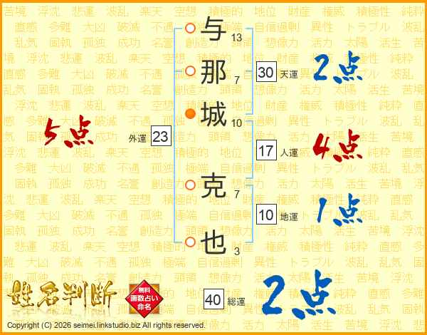生活面を象徴する運勢です。外部から受ける影響力を表し、結婚運、家庭運や職場、環境への順応性を表します。総運から人運を引いた画数。姓や名が1文字の場合を除く。