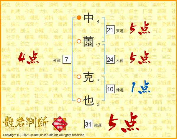 あなたの人生を表す1番重要な運勢です。生涯を通じて影響する総合運となり、主に50歳以降の晩年期に影響を及ぼします。苗字と名前の合計画数。