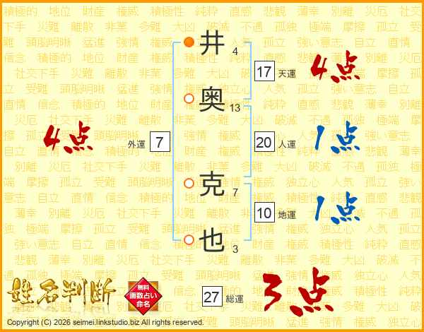 井(4画)奥(13画) 克(7画)也(3画)
