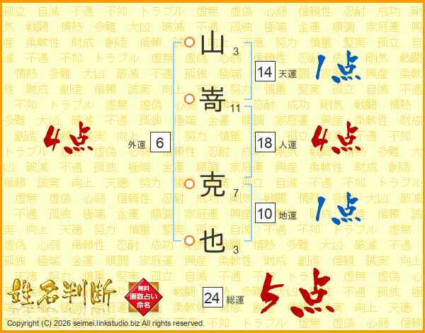 生活面を象徴する運勢です。外部から受ける影響力を表し、結婚運、家庭運や職場、環境への順応性を表します。総運から人運を引いた画数。姓や名が1文字の場合を除く。