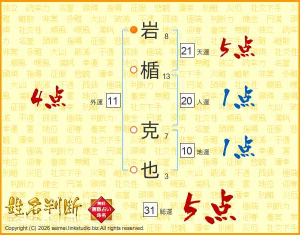 岩楯克也さんの総運は31画の5点!