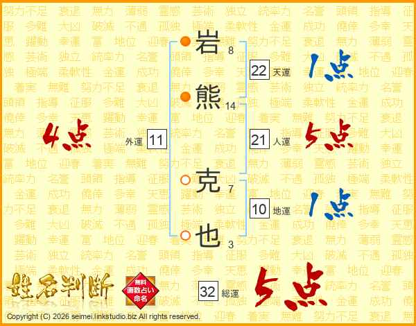 あなたの人生を表す1番重要な運勢です。生涯を通じて影響する総合運となり、主に50歳以降の晩年期に影響を及ぼします。苗字と名前の合計画数。