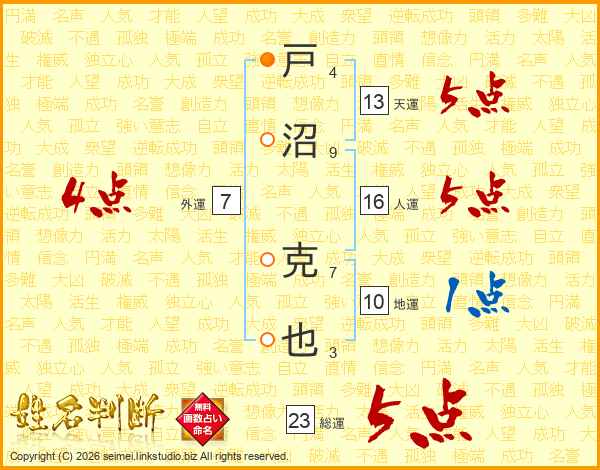 戸沼克也さんの総運は23画の5点!