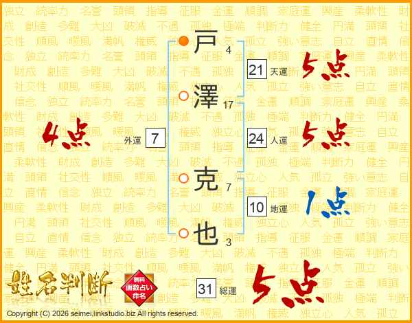 あなたの人生を表す1番重要な運勢です。生涯を通じて影響する総合運となり、主に50歳以降の晩年期に影響を及ぼします。苗字と名前の合計画数。