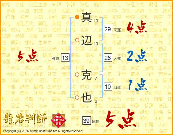 真辺克也さんの総運は39画の5点!