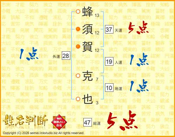 蜂(13画)須(12画)賀(12画) 克(7画)也(3画)