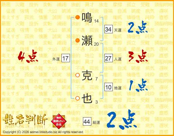 鳴瀬克也さんの総運は44画の2点!