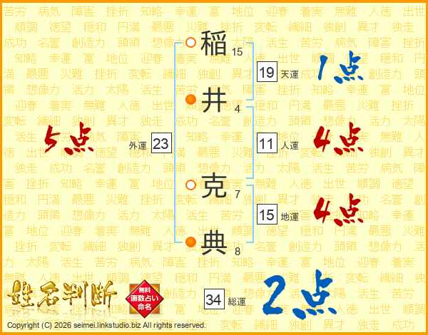 稲(15画)井(4画) 克(7画)典(8画)