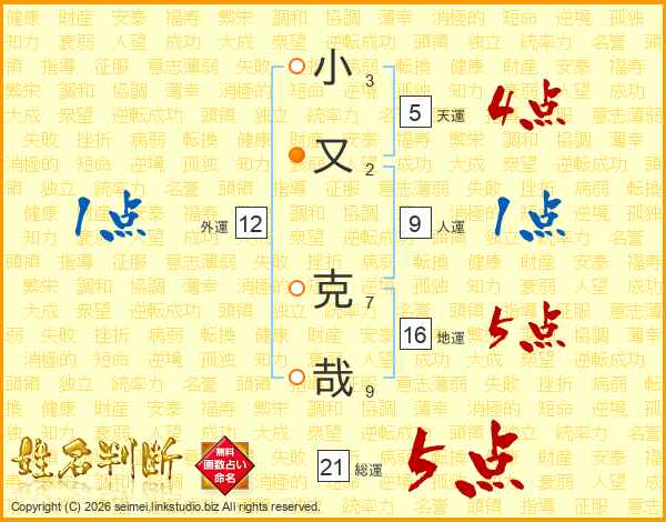 生活面を象徴する運勢です。外部から受ける影響力を表し、結婚運、家庭運や職場、環境への順応性を表します。総運から人運を引いた画数。姓や名が1文字の場合を除く。