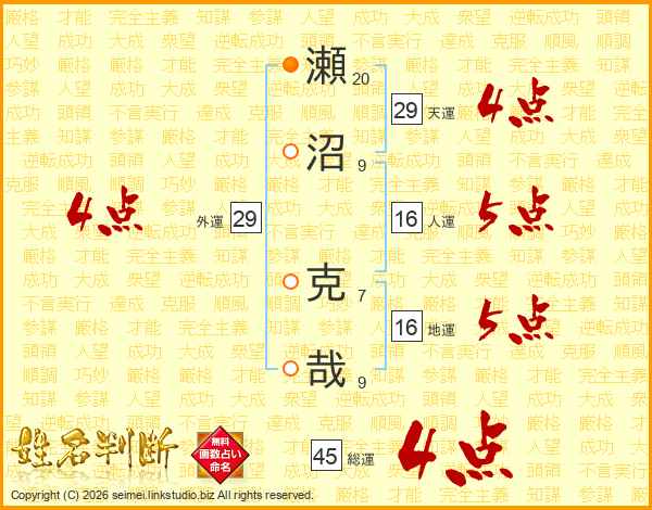瀬(20画)沼(9画) 克(7画)哉(9画)