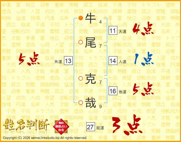 牛(4画)尾(7画) 克(7画)哉(9画)