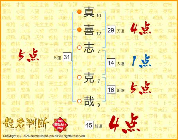 真(10画)喜(12画)志(7画) 克(7画)哉(9画)