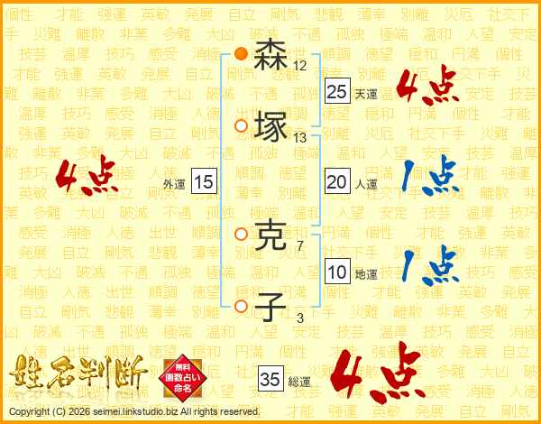 生活面を象徴する運勢です。外部から受ける影響力を表し、結婚運、家庭運や職場、環境への順応性を表します。総運から人運を引いた画数。姓や名が1文字の場合を除く。