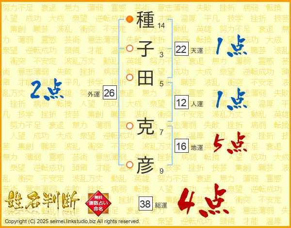 種(14画)子(3画)田(5画) 克(7画)彦(9画)